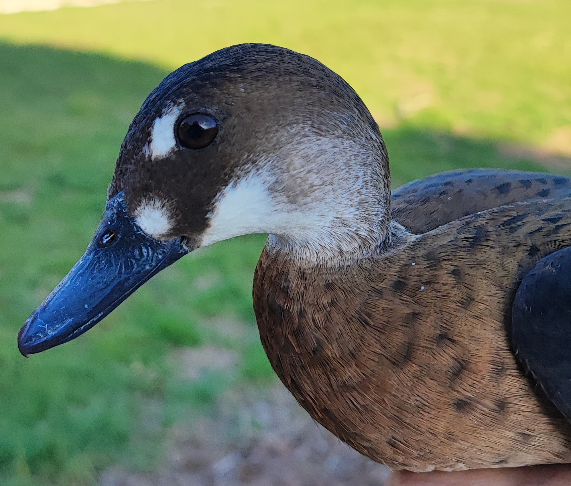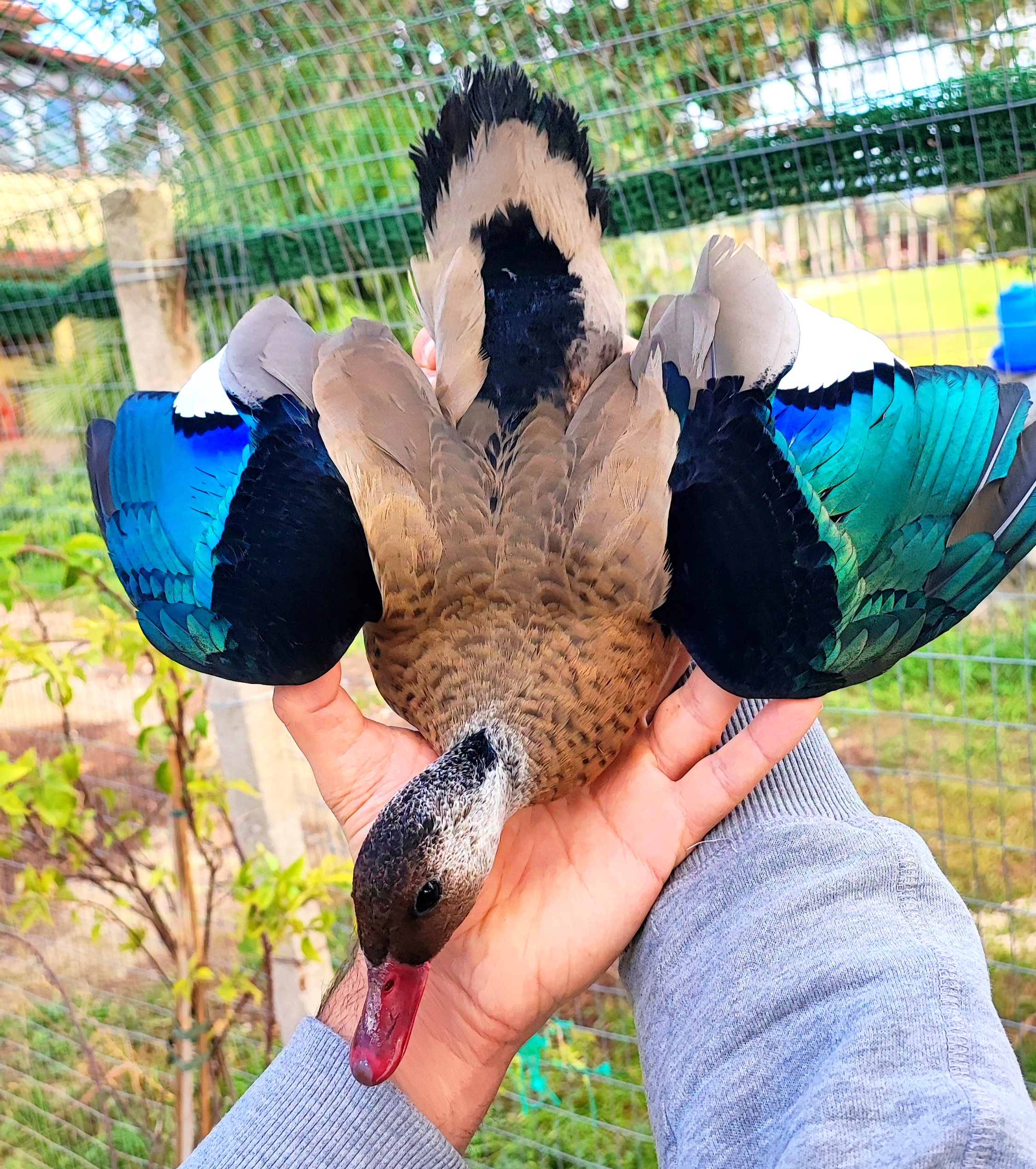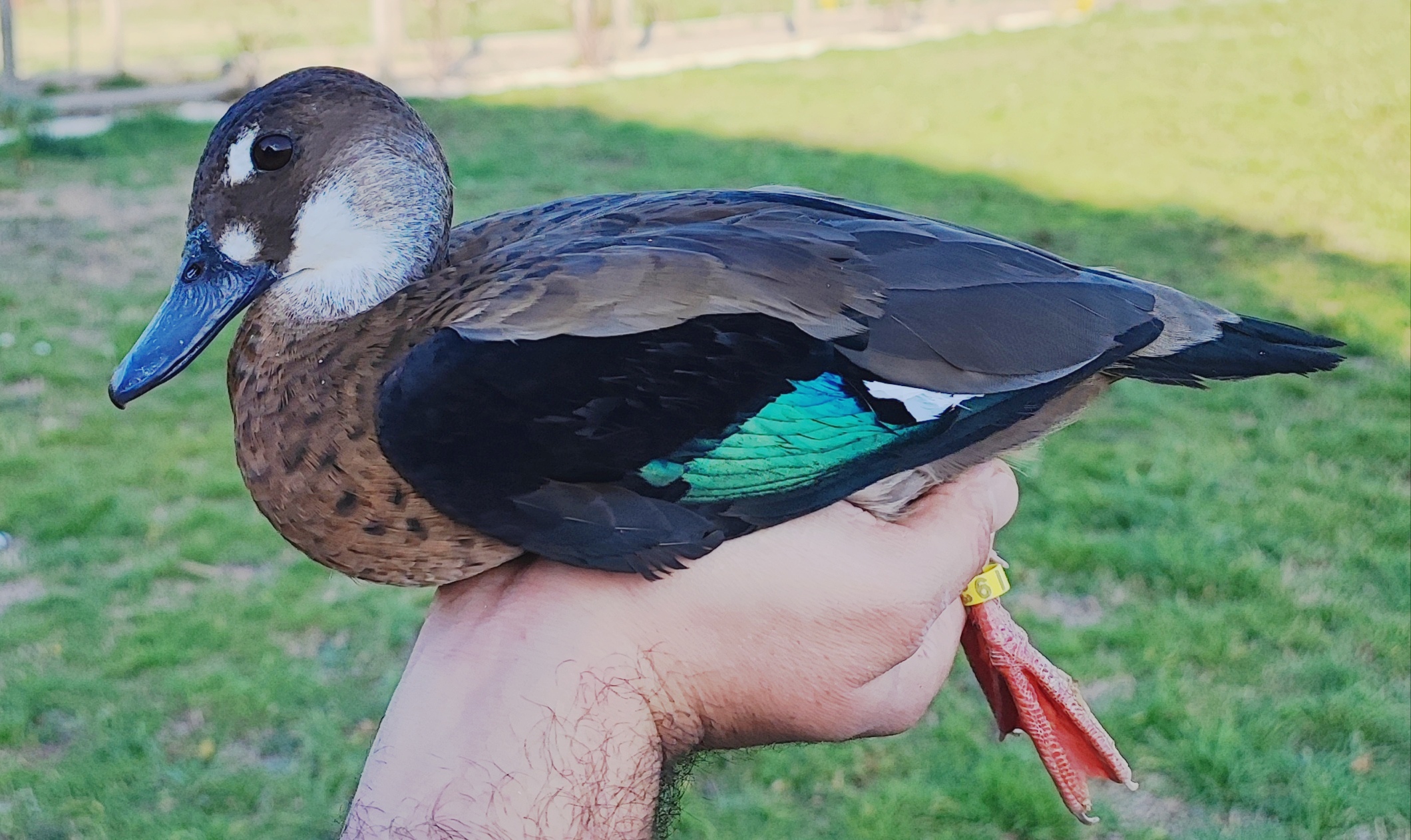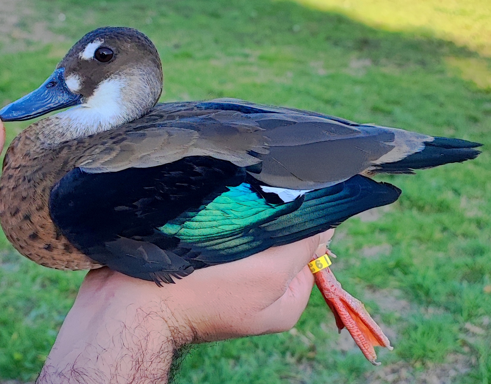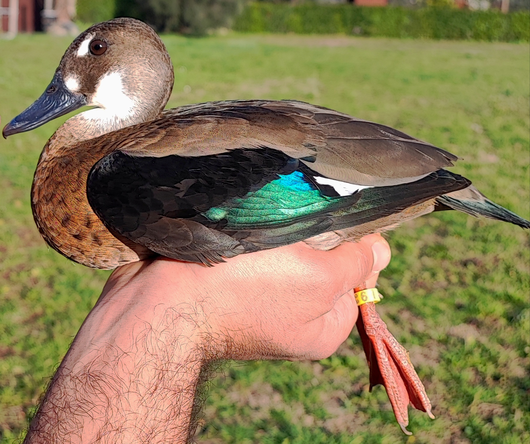 Il maschio e la femmina hanno un piumaggio molto simile, di colore marroncino chiaro, il petto è chiazzato leggermente da un tenue marrone, il dorso è marrone, la testa è marrone ma ai lati sulle guance e la parte superiore del collo sono bianco-grigie, le penne timoniere della coda sono nere, le ali spiegate sono nere alle estremità mentre verso l’interno hanno un esteso specchio blu-verde metallico, le zampe sono rosso-arancio, gli occhi sono neri. Le uniche caratteristiche esteriori che contraddistinguono i sessi sono il becco che nel maschio è rosato, mentre nella femmina è grigio piombo; nella femmina la zona del capo vicino al becco presenta una piccola chiazza bianca che si ripete anche attorno all’occhio con una sorta di sopracciglio, nel maschio invece non è presente.
