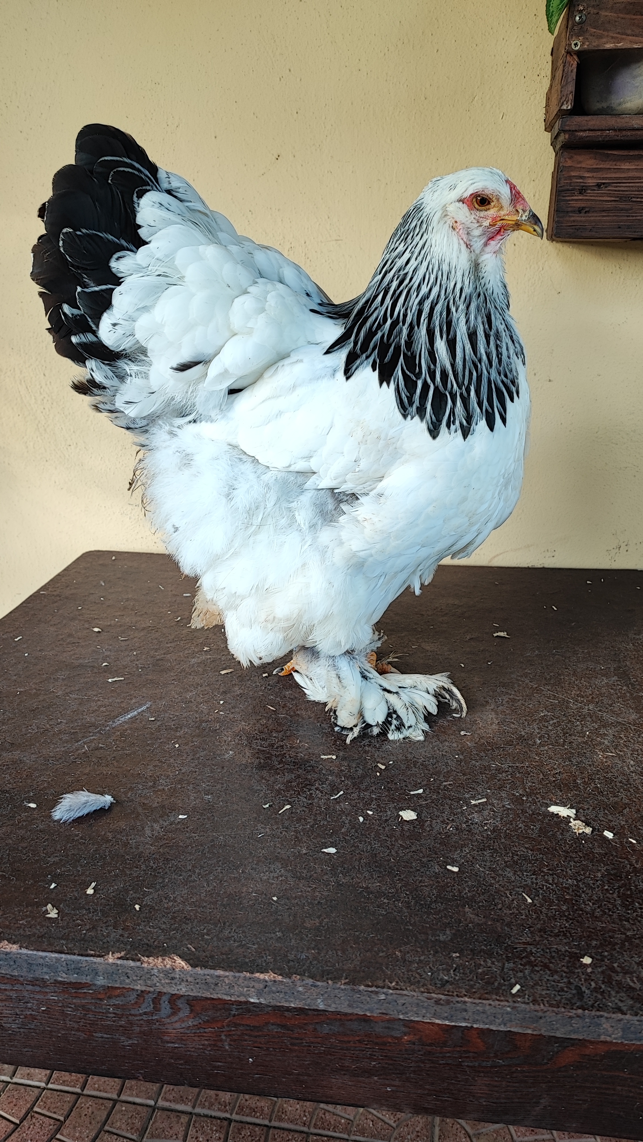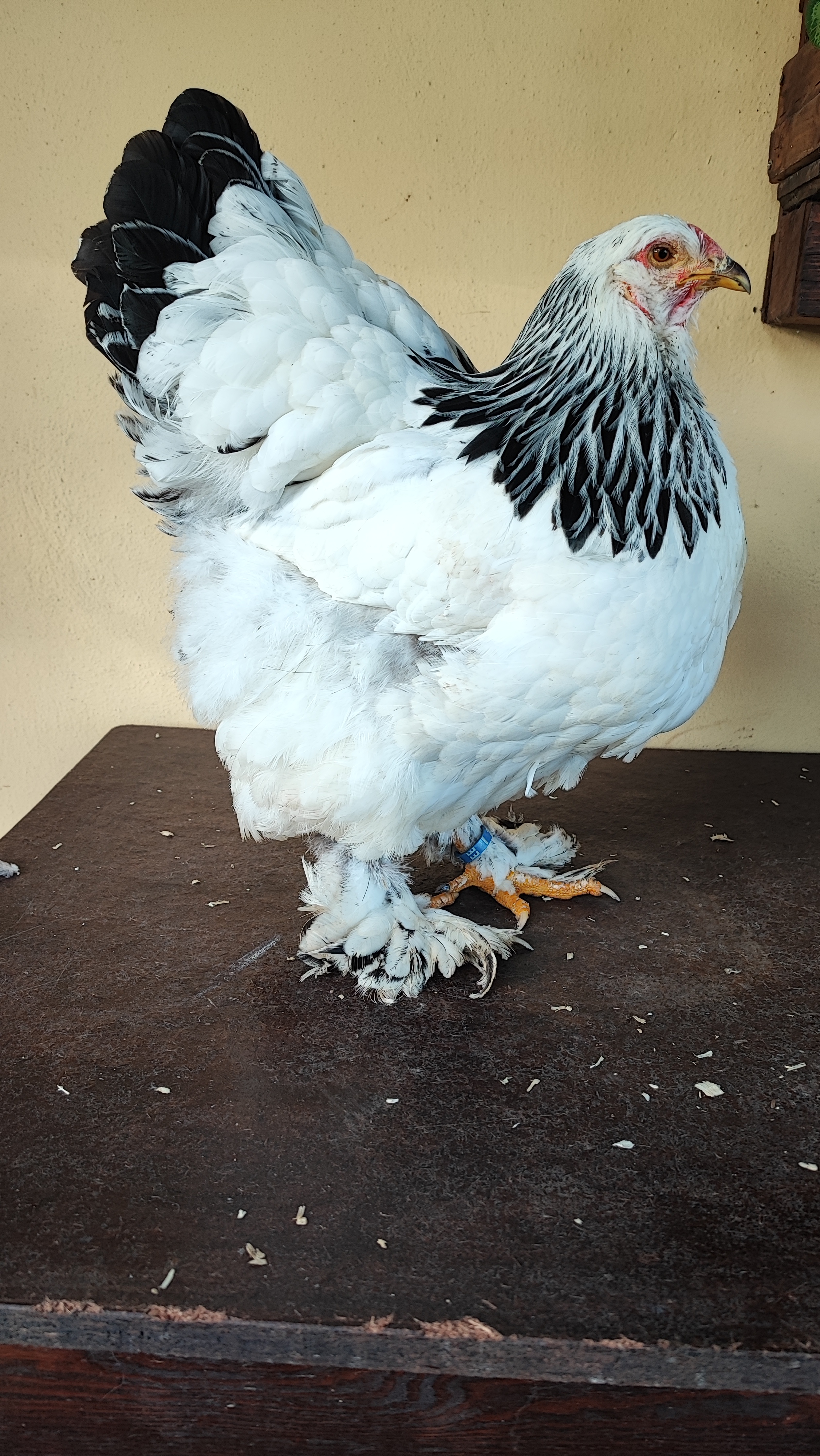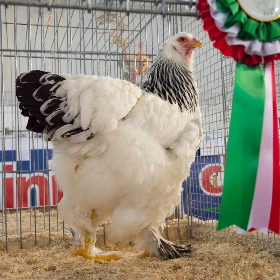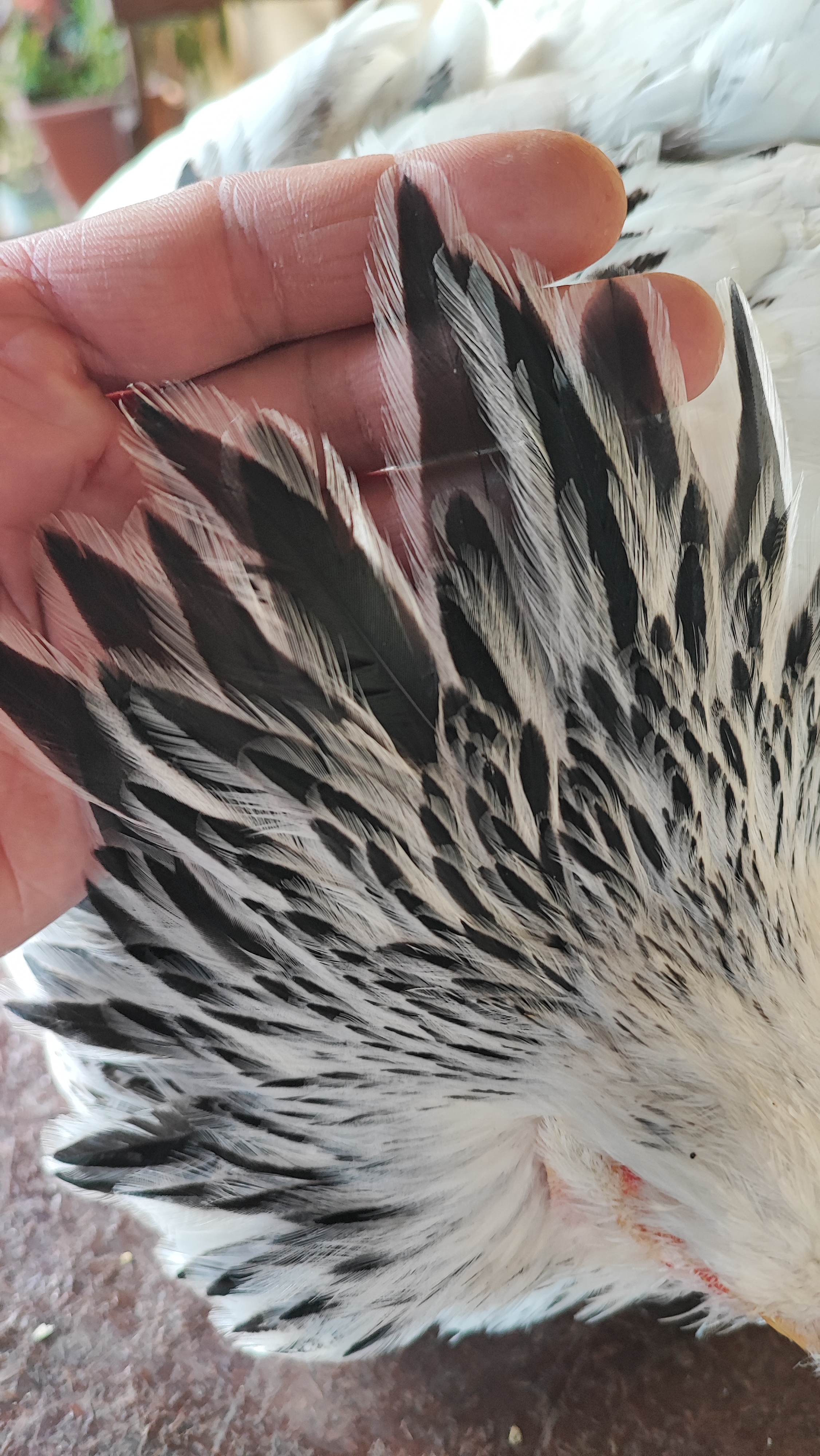 Disegno quasi identico nei due sessi. Testa bianco puro. Mantellina con larghe fiamme nere a riflessi verdi e orlatura bianca argento. Le penne all’altezza delle spalle, nascoste dalla mantellina, presentano un disegno a gocce nere irregolare. Leggera presenza di fiamme nella groppa del gallo. Groppa della gallina sempre bianco puro. Coda del gallo nero puro con riflessi verdi. Piccole falciformi nere orlate di bianco. Coda della gallina nera , le due grandi copritrici della coda orlate di bianco tollerate; piccole copritrici orlate di bianco. Remiganti primarie nere con bordo esterno bianco. Remiganti secondarie con barbe interne nere e barbe esterne bianche, così che il triangolo dell’ala appare bianco. Piumaggio dei tarsi bianco con disegno nero nel ventaglio. Resto dl piumaggio bianco puro. Piumino grigio.
