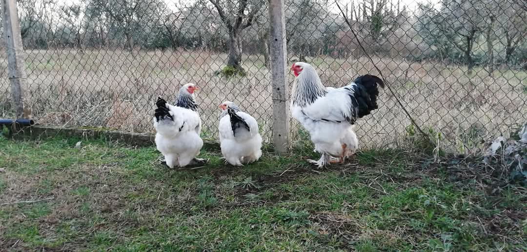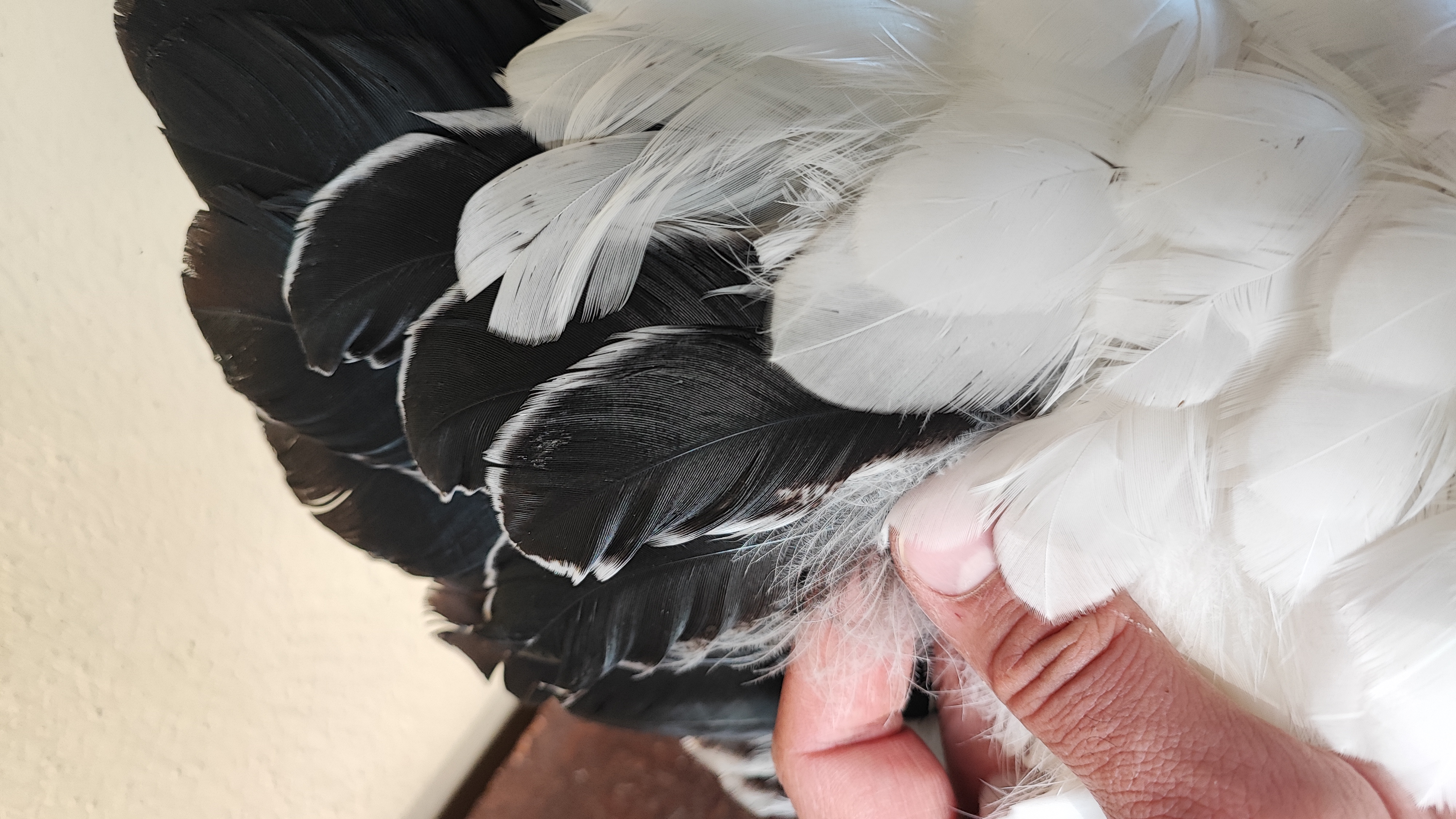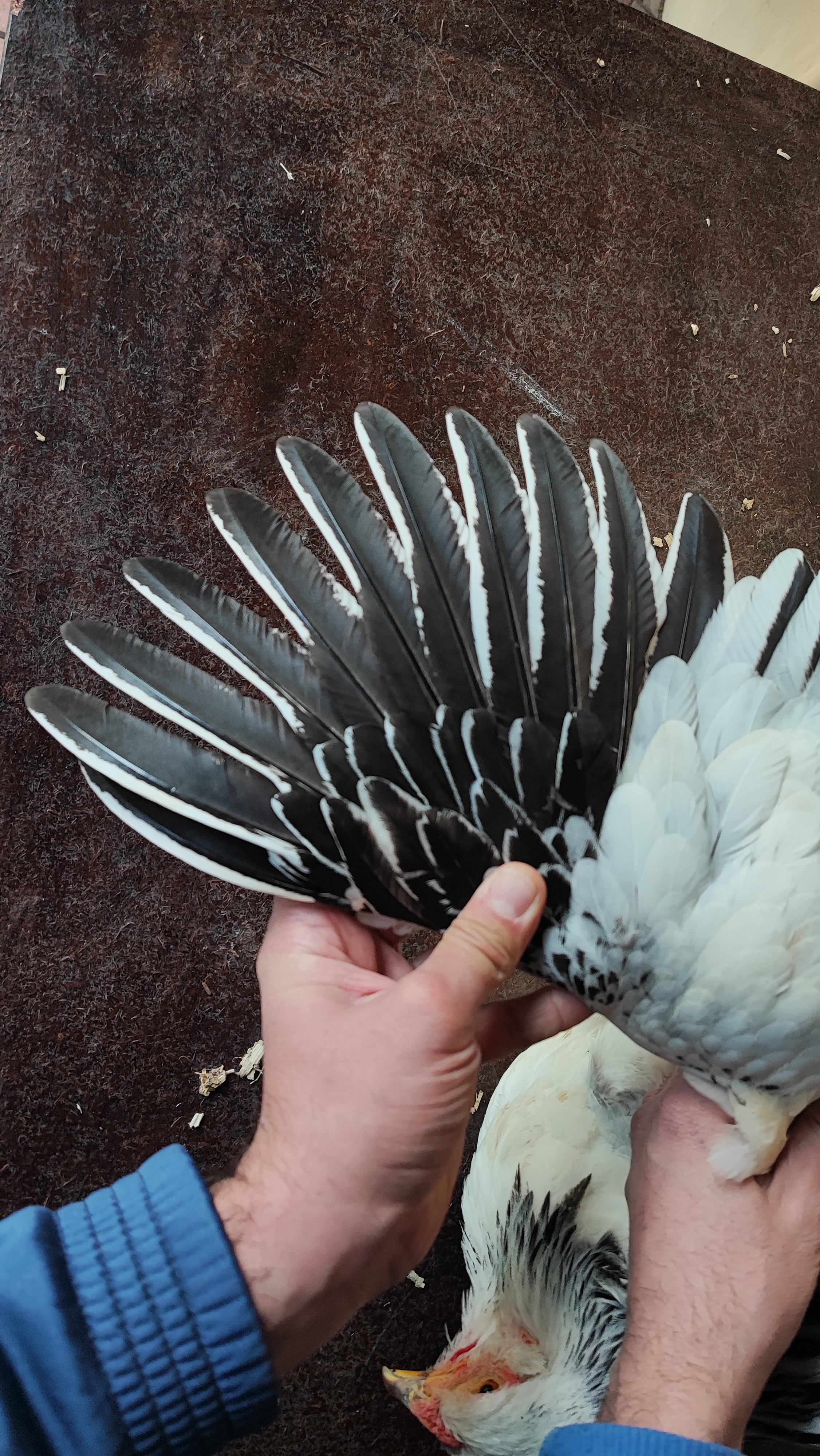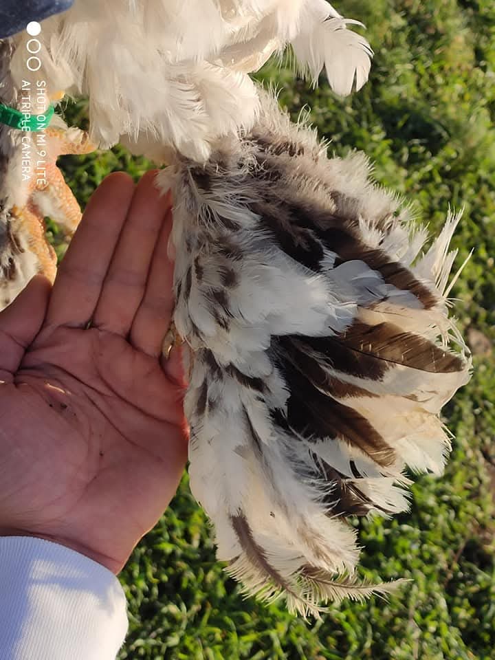 Disegno quasi identico nei due sessi. Testa bianco puro. Mantellina con larghe fiamme nere a riflessi verdi e orlatura bianca argento. Le penne all’altezza delle spalle, nascoste dalla mantellina, presentano un disegno a gocce nere irregolare. Leggera presenza di fiamme nella groppa del gallo. Groppa della gallina sempre bianco puro. Coda del gallo nero puro con riflessi verdi. Piccole falciformi nere orlate di bianco. Coda della gallina nera , le due grandi copritrici della coda orlate di bianco tollerate; piccole copritrici orlate di bianco. Remiganti primarie nere con bordo esterno bianco. Remiganti secondarie con barbe interne nere e barbe esterne bianche, così che il triangolo dell’ala appare bianco. Piumaggio dei tarsi bianco con disegno nero nel ventaglio. Resto dl piumaggio bianco puro. Piumino grigio.