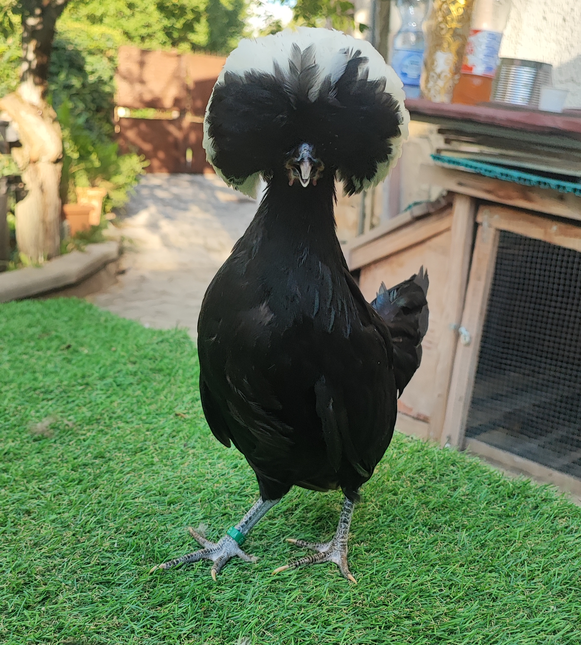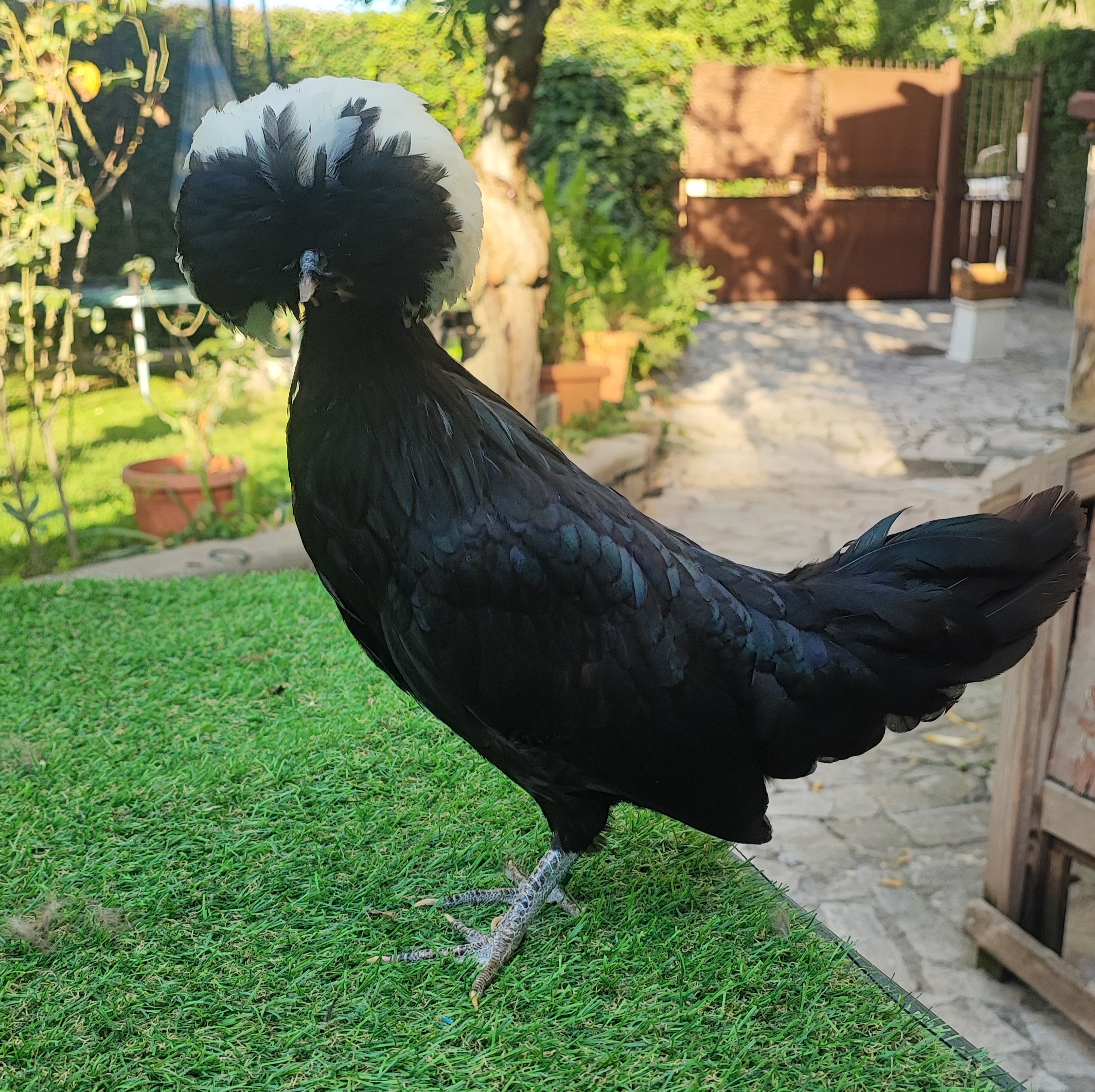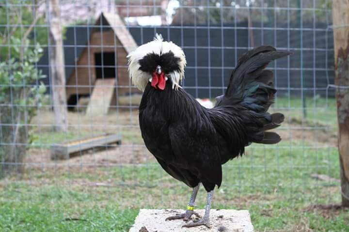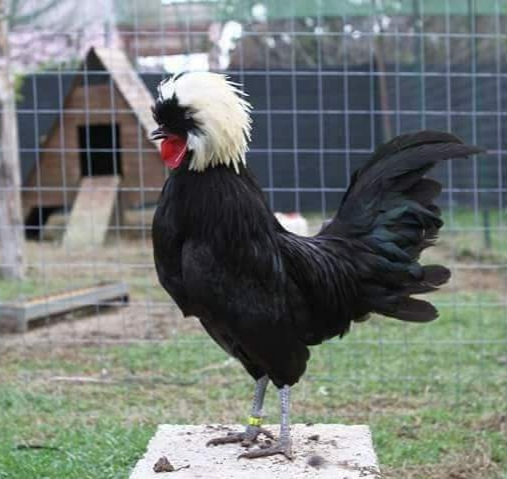 Mantello di colore nero a riflessi verdi.Ciuffo bianco.Becco corno scuro. Tarsi neri fino a blu ardesia scuro.