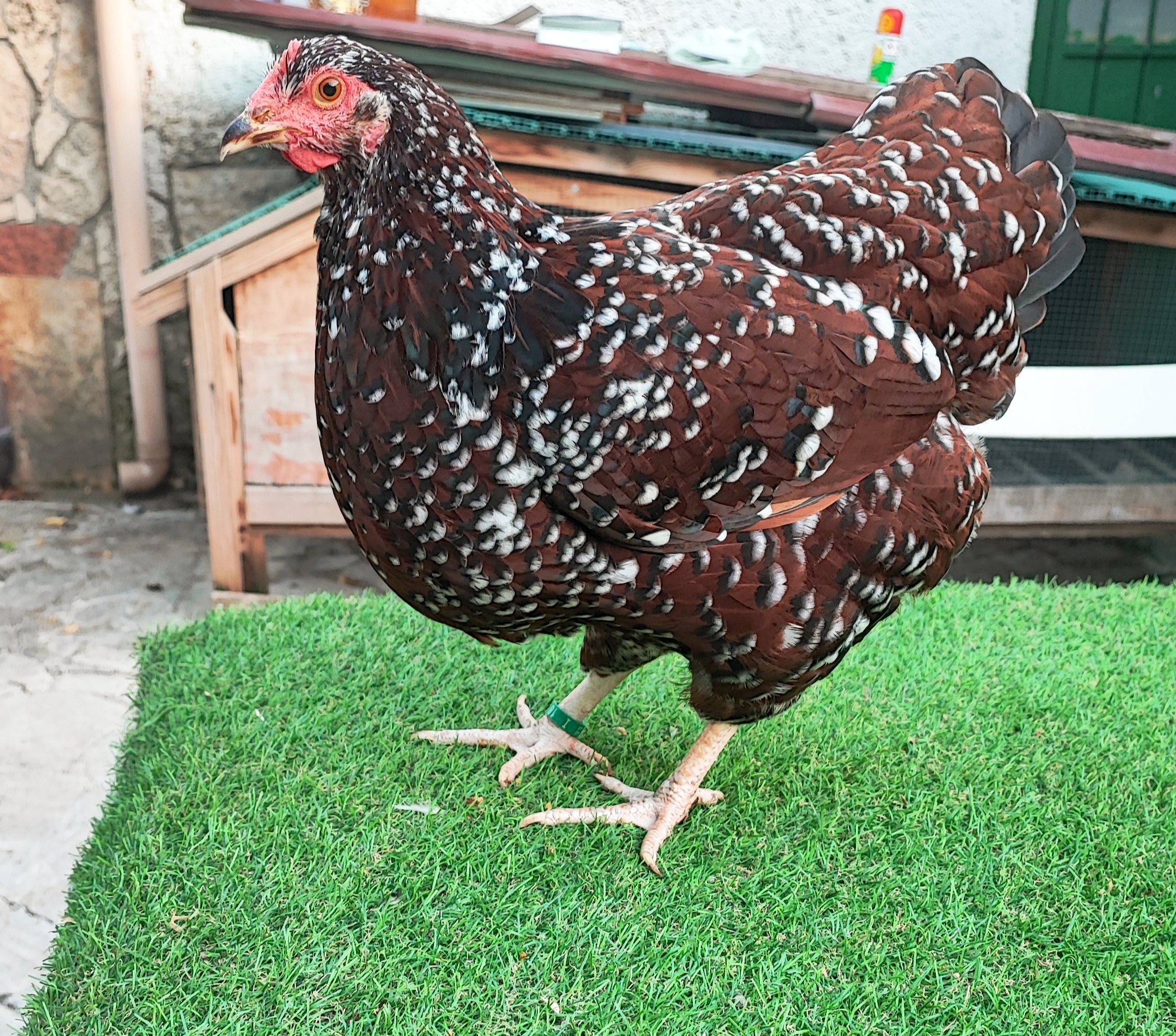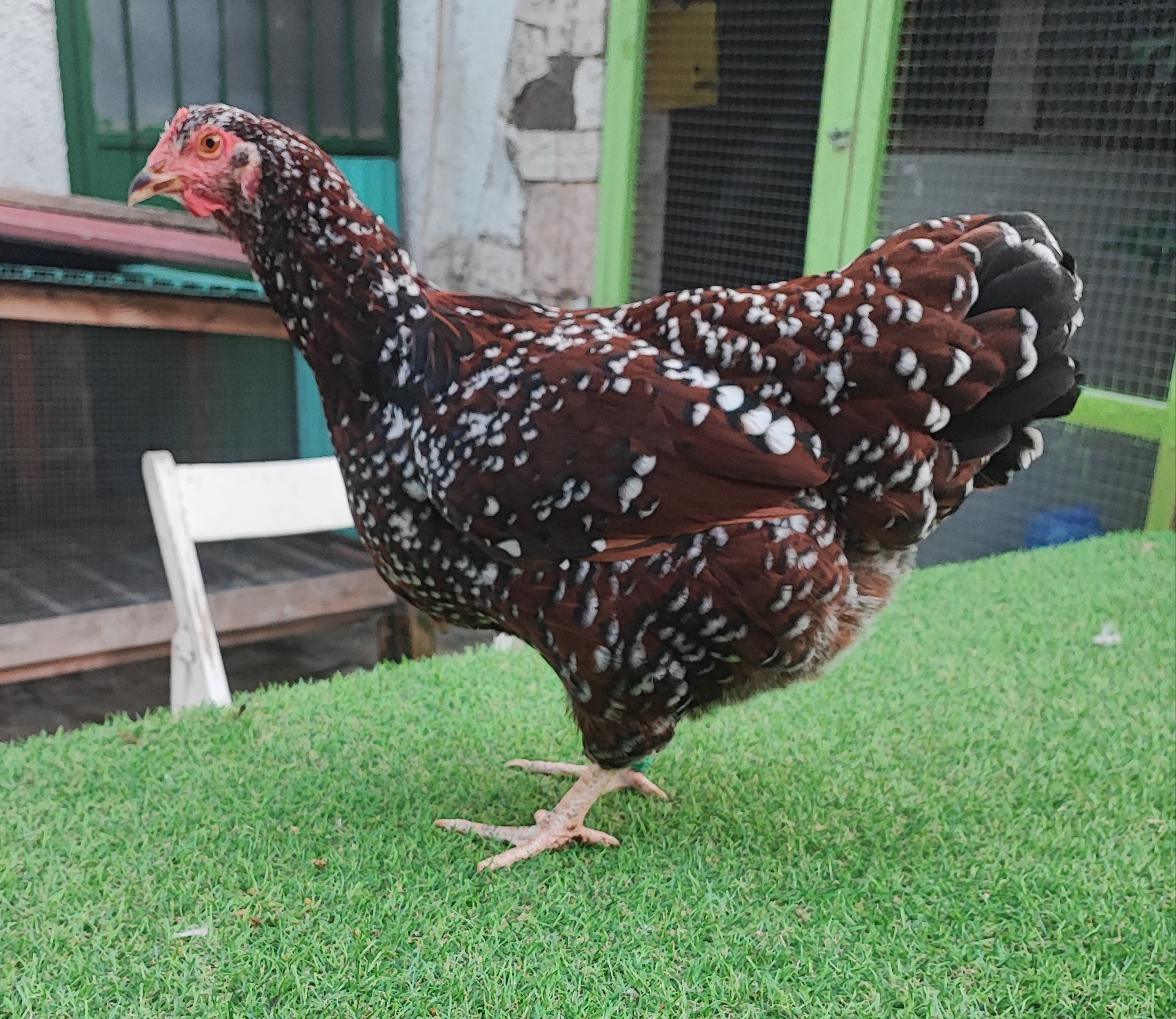 Colore di fondo bruno castagna, nella gallina è un po’ più chiaro. Ogni piuma termina con una paillette nera a riflessi verdi sulla punta della quale vi è una perla bianca, salvo che sulle penne del dorso e delle spalle del gallo. Remiganti brune con barbe interne nere e punta bianca. Le due ultime file di grandi copritrici delle ali presentano delle paillette nere con perla bianca che creano così il disegno sulle fasce dell’ala. Timoniere e falciformi nere a punta bianca. Delle remiganti parzialmente bianche, non in numero eccessivo e non visibili esteriormente quando l’ala è chiusa, come pure un po’ di bianco nelle timoniere, sono tollerate. La picchiettatura bianca tende ad aumentare ed estendersi con l’età.