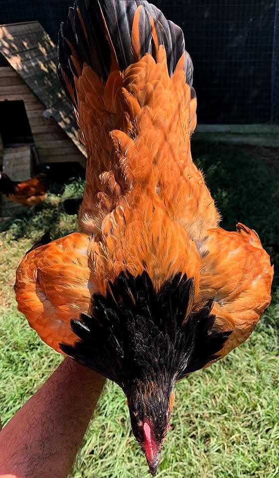 Piumaggio fulvo dorato intenso. Testa, mantellina e coda nere, orlatura fulva dorata ammessa nelle piccole falciformi inferiori. Groppa fulvo dorato sostenuto con fini fiamme nere. Remiganti con barbe esterne fulvo dorato intenso e barbe interne nero fino a grigio-nero. Piumino grigio.